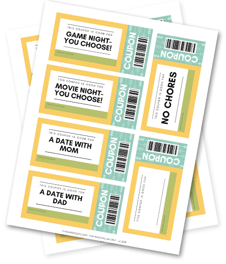 Give the gift of time together with these printable coupons for kids! You get three PDF pages, including a page of blank coupons you can use to write in your own ideas!